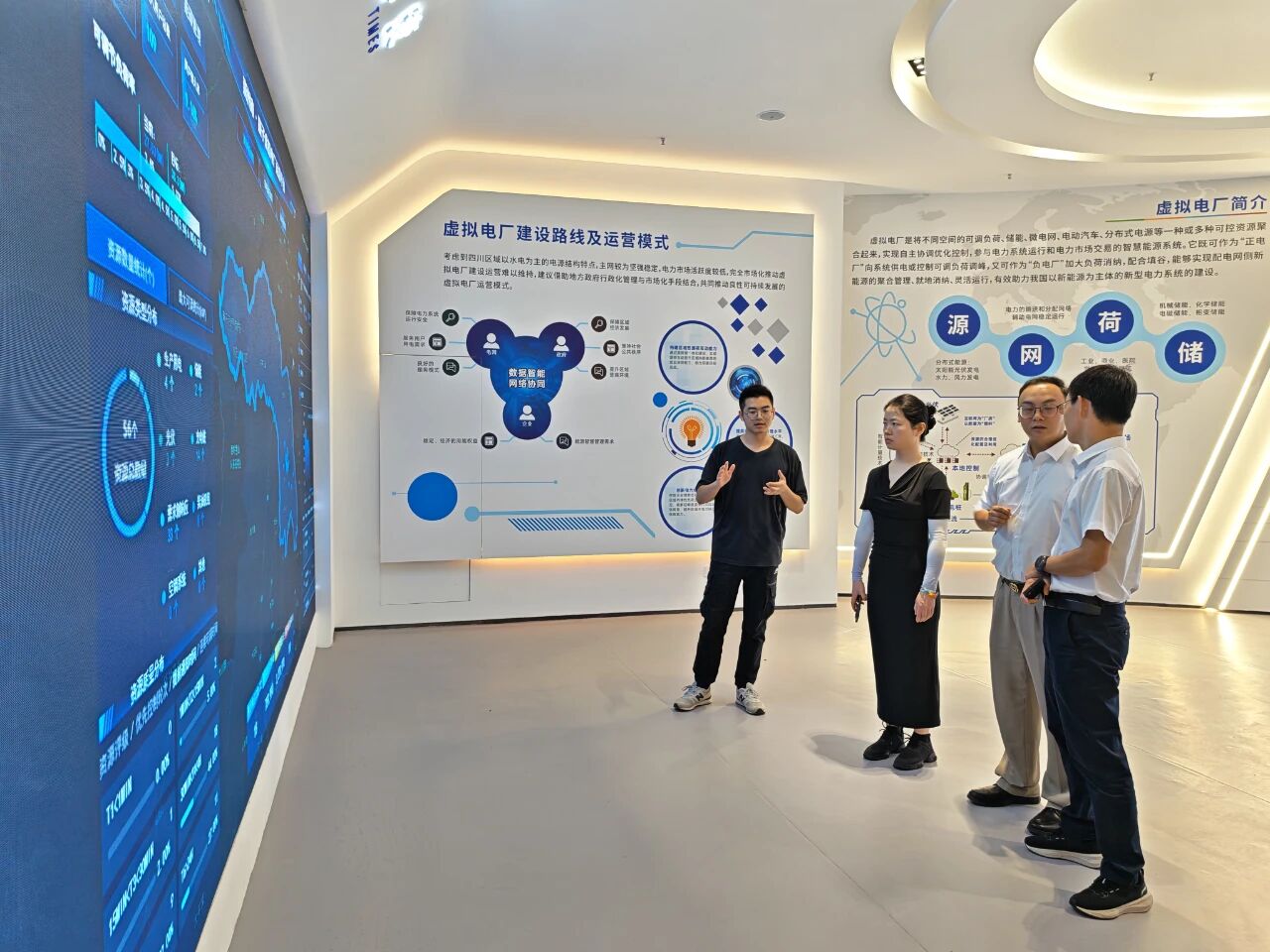 考察团一行首先参观了智网AI中心展厅,详细了解了智网发展历程、业务布局以及核心项目的运行模式和创新能力。智网公司负责人重点介绍了公司在能源数字化,量子虚拟电厂建设,光伏、储能系统集成等领域的核心技术成果与实际应用成效。