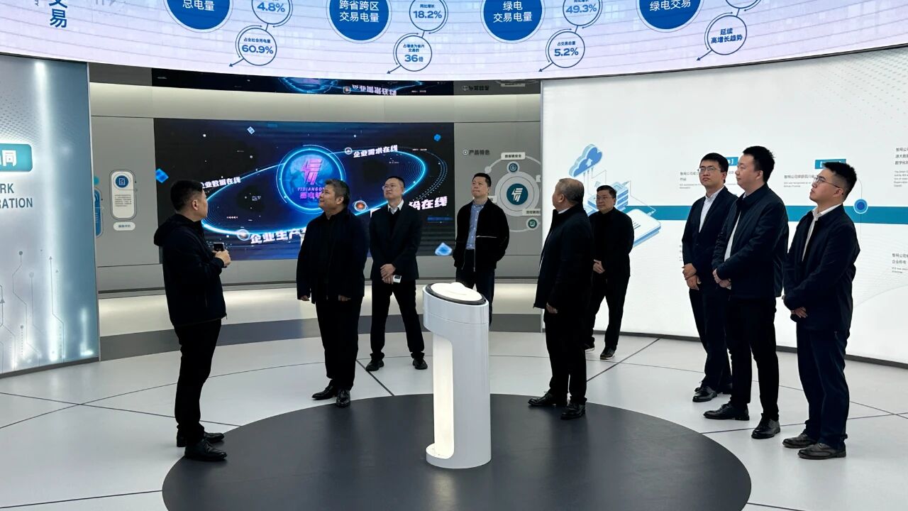 吴爱军一行参观了智网AI中心展厅,深入了解了智网公司在量子虚拟电厂、整县能源托管、智能体互联网等领域的平台建设、运营成果与前沿实践,对智网公司在能源数字化与智能化方面的综合能力表示高度认可。
